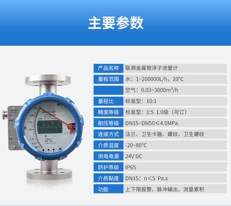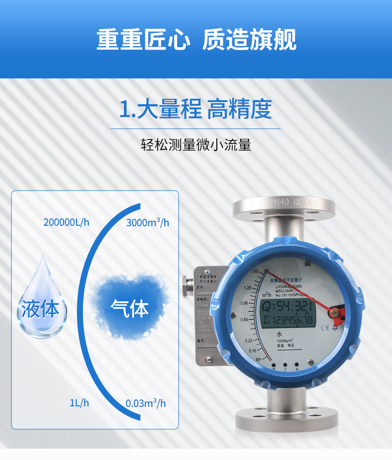 產品特點:小流量可測、可做防腐款、液晶指針均可 適用于小口徑和低流速介質流量的檢測 較寬的量程比10:1,特殊型20:1 雙行大液晶屏幕顯示,自帶背光 可同時顯示瞬時流量和累計流量